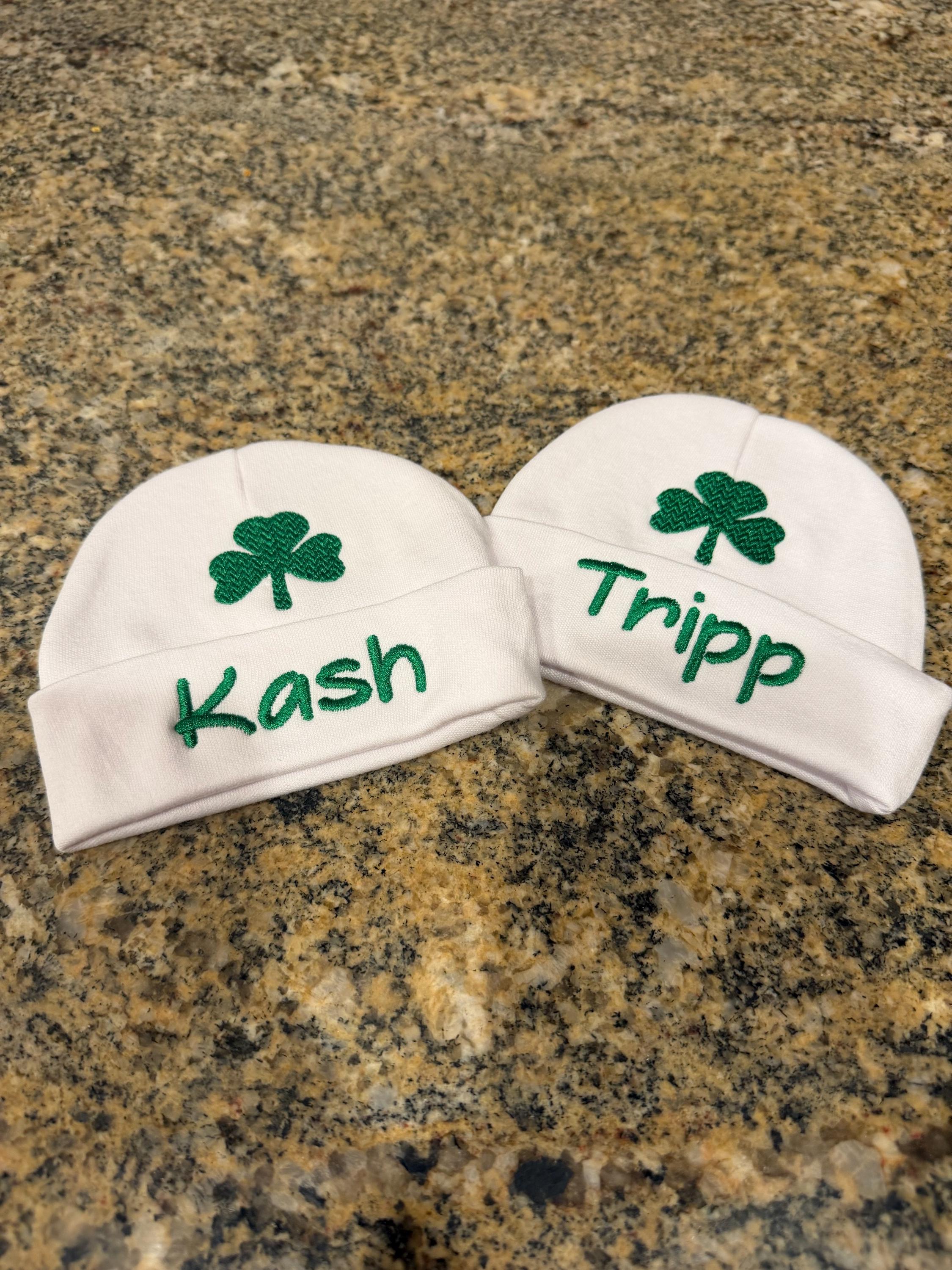 Celebrate your Irish pride with this custom embroidered hat with shamrock design. Customize this soft baby hat with the baby's name, nickname, or any other word or short phrase. These hats make a great baby shower gift, newborn gift or preemie baby gift. They also look great in NICU pictures and make a great newborn photo prop.